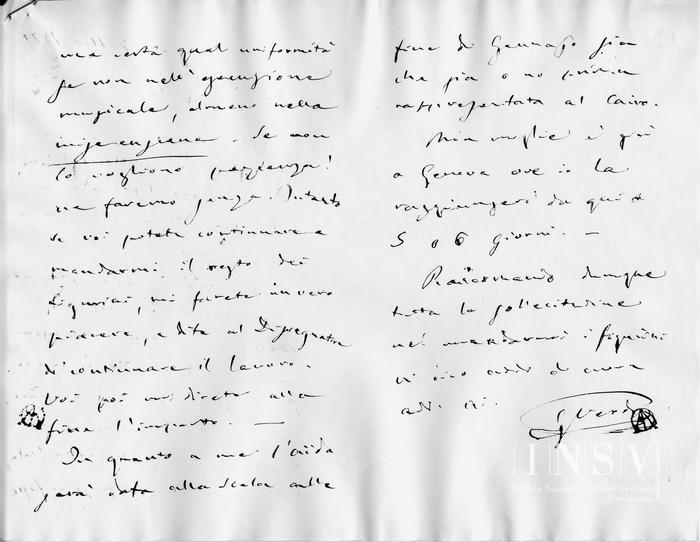 È strano, assai strano il prevedere di questi bravi Bey, e mi sorprende assai quello di Mariette!! A ma pare che doveva interessare loro che trattandosi di un teatro come quello della Scala, tutto fosse ben fatto, e vi fosse una certa qual uniformità se non nell'esecuzione musicale, almeno nella mise en scene, – Se non lo vogliono pazienza! ne faremo senza. Intanto se voi potete continuare a mandarmi il resto dei figurini, mi farete invero piacere, e dire al Disegnatore di continuare il lavoro. Voi poi mi direte alla fine l'importo. –