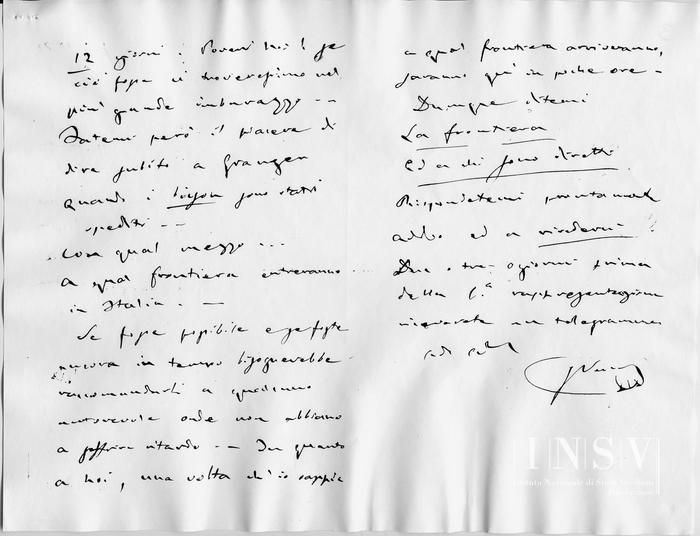 Ricevo la vostra, ove sento con dispiacere i vostri mali, che fortunatamente son passati – Non ho ricevuto i biyou di Granger, ma potrebbe darsi che li ricevessi oggi!!... ma ahimé! Ricordi mi dice di non sperarlo perché le corrispondenze dalla Ferrovia Francesi ed Italiane sono così irregolari, che non vi è da contar sopra: e che potrebbero tardare anche 10 o 12 giorni. Poveri noi: se così fosse vi troveressimo nel più grande imbarazzo... fatemi però il piacere di dire subito a Granger quando i biyou sono stati spediti...