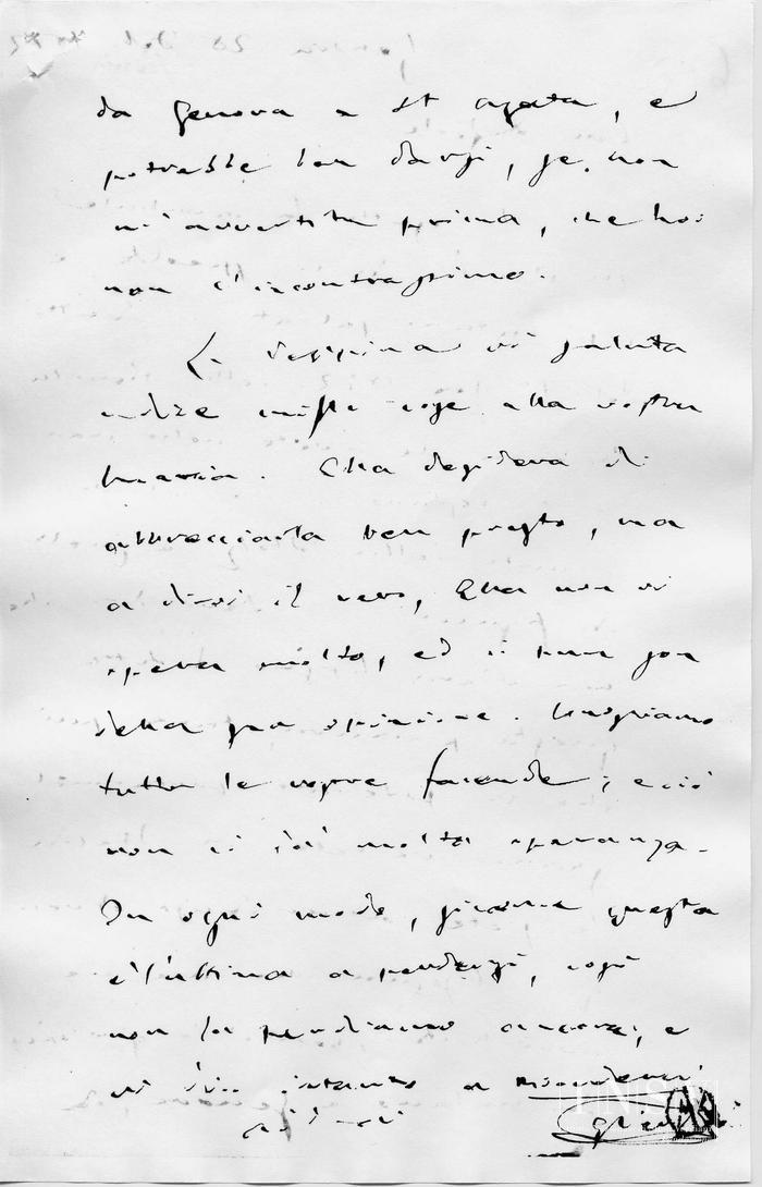 La Peppina vi saluta e dice mille cose alla vostra Maria. Ella desidera di abbracciarla ben presto, ma a dirvi il vero, Ella non vi spera molto, ed io pure sono della sua opinione. Conosciamo tutte le vostre faccende; e ciò non ci dà molta speranza. In ogni modo, [...] questa è l'ultima a perdersi, così non la perdiamo ancora e vi dico intanto a rivederci
