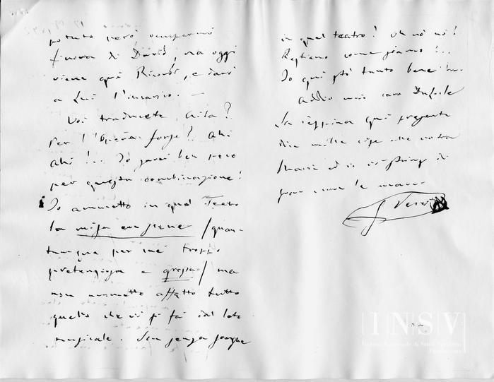 Addio mio caro Du Locle. La Peppina quì presente dice mille cose alla vostra Maria ed io vi stringo di gran cuore le mani...