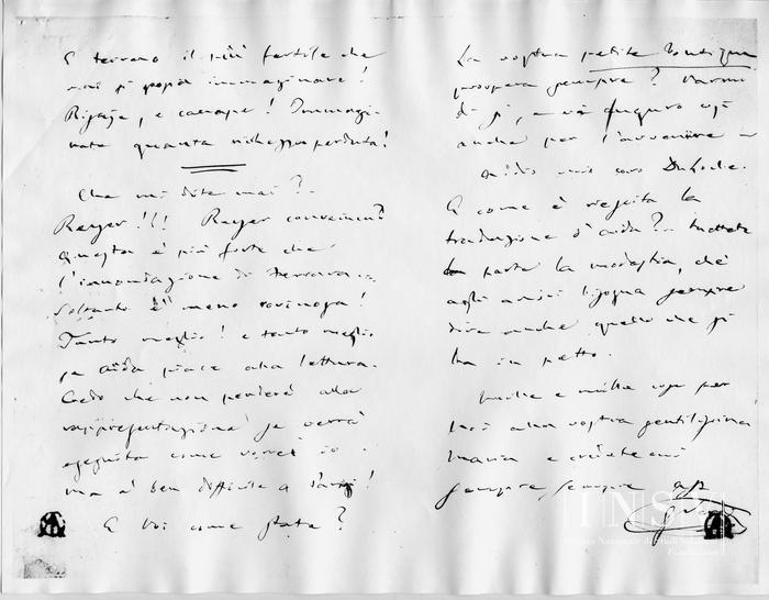Avete ben ragione di lagnarvi se non vi scrivo da un secolo. Ho proprio tutto il torto io, perché in questi ultimi tempi non ho avuto quasi nulla a fare. Vivo in un'ozio completo; nissuno mi disturba, e nemmeno il Po', che ha rovinato tanti paesi nel Ferrarese, ha lasciato noi in pace. Tanto meglio per noi, ma quella povera gente!! Quante ruine!! Si tratta niente meno che di un centinajo di kilometri in quadrato; tutto innondato! È terreno il più fertile che mai si possa immaginare! Risaje, e canape! Immaginate quanta ricchezza perduta!