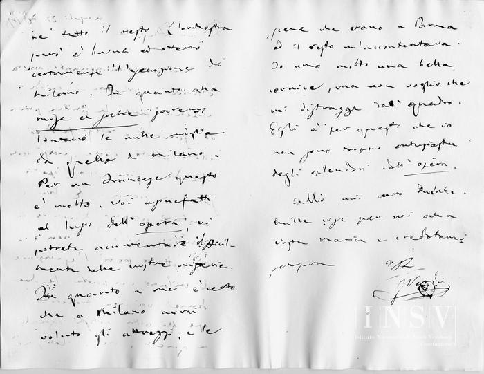 Non sono incominciate ancora le prove d'orchestra d'Aida. Appena fatta la prima prova vi scriverò, o telegraferò, ed allora potete essere quasi certo che dieci giorni dopo, l'opera sarà in scena. E voi contate proprio di venire a risentire Aida?... Non vi aspettate però l'esecuzione di Milano. A parte le due donne, Voi non troverete quì gli altri artisti eguali a quelli, né i Cori, né né tutto il resto. L'orchestra però è buona ed otterrò certamente l'esecuzione di Milano. In quanto alla mise en scène saremo lontano le mille miglia da quella di Milano. Per un Francese questo è molto Voi assuefatti al lusso dell'Opéra vi potrete accontentare difficilmente delle nostre scene. In quanto a me è certo che a Milano avrei voluto gli attrezzi, e le scene che erano a Parma ed il resto m'accontentava. Io amo molto una bella cornice, ma non voglio che mi distragga dal quadro. Egli è per questo che non sono troppo entusiasta degli splendori dell'Opéra.