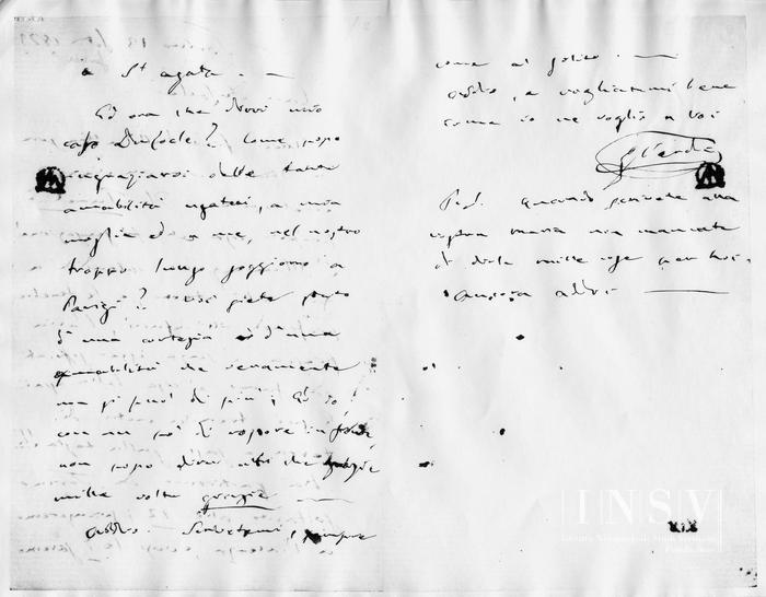 - Un bifolio, due facciate e mezza scritte. Sulla prima facciata, in alto a sinistra, di mano recente, a matita, entro circoletto: «333.». Sotto la data, di altra mano: «fevrier?». Timbri dell'Archive de l'Opéra di Parigi.