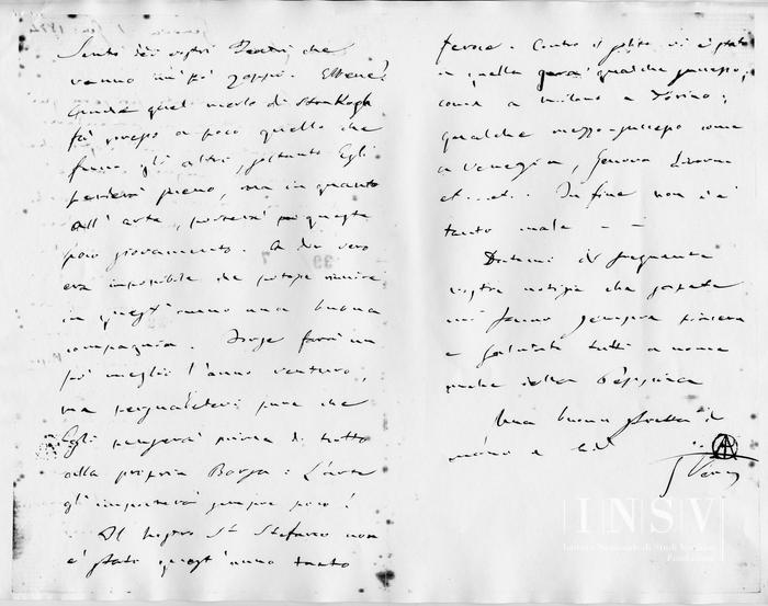 - Un bifolio, due facciate e tre quarti scritte, con busta affrancata (40 cent.). Sulla prima facciata, in alto a sinistra, a matita, di altra mano, entro circoletto: «189.»; sul recto della busta, analogamente: «189 bis». Timbro dell'Archive de l'Opéra.