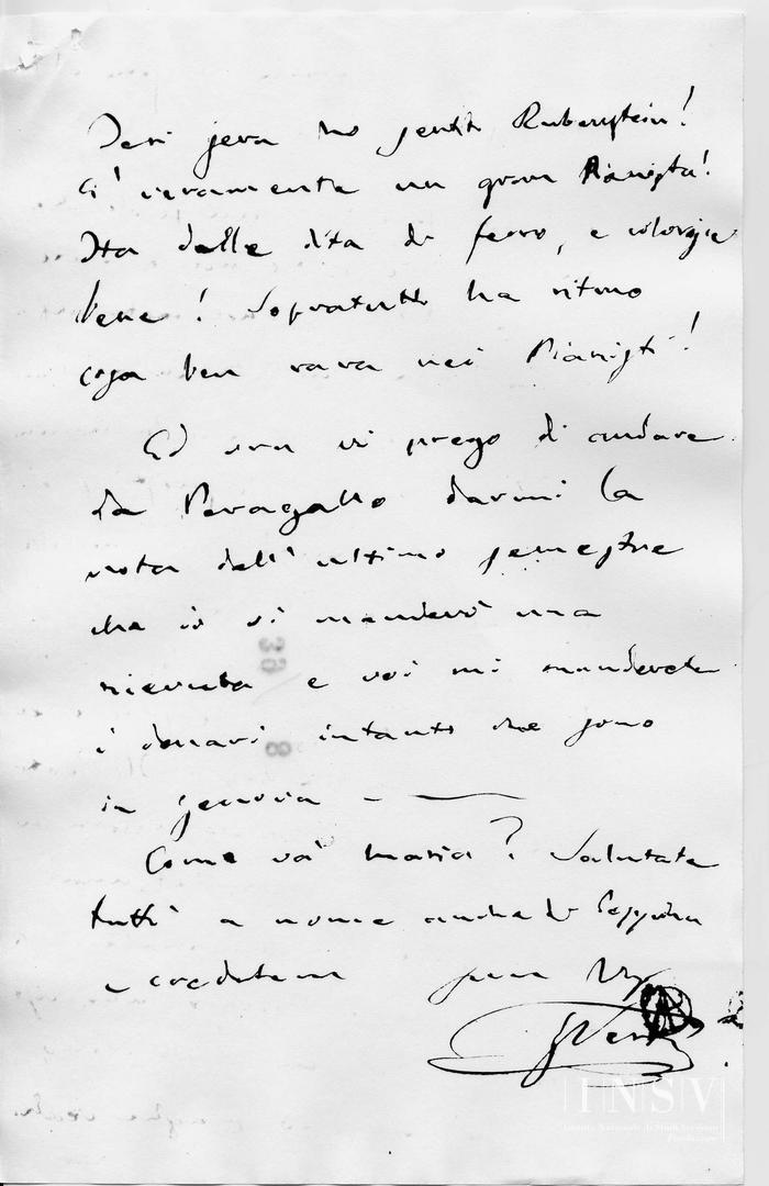 Nulla ho a dirvi dei nostri Teatri! Sono sempre le solite vicende ed i soliti alti e bassi. Il Teatro della scala ha trovato ancora un altro successo col Macbet nuovo! Napoli pure non va male... E Roma che, malgrado una vistosissima dote, va malissimo! Ma là vi sono piaghe vecchie! Ieri sera ho sentito Rubenstein! È veramente un gran Pianista! Ha delle dita di ferro, e colorisce bene! Sopratutto ha ritmo cosa ben rara nei Pianisti!