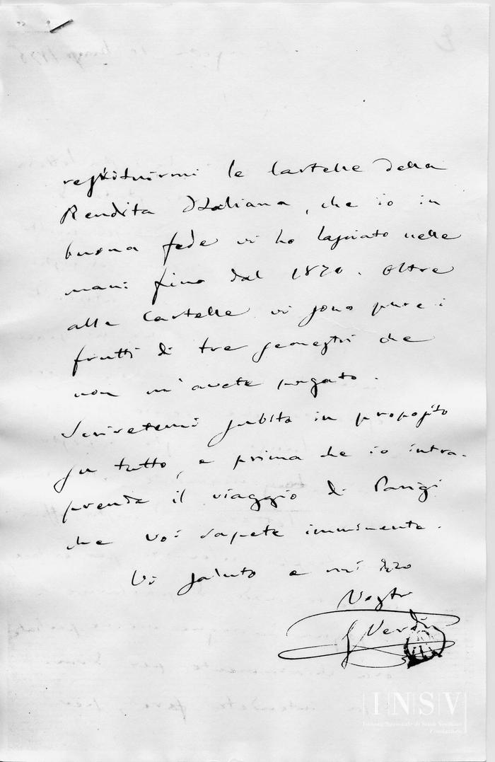 Ho ricevuto la vostra lettera che mi parla dello stato di vostra salute, e capisco molto bene che gli affari del vostro Teatro, possono aver contribuito a peggiorarla. Me ne spiace sinceramente; ma io avrei desiderato che, senza scrivere più a lungo, aveste risposto più categoricamente alla mia ultima lettera. I nostri affari sono troppo rilevanti, per evitare, in certo modo, di parlarne. Bisogna dumque me ne parliate ora chiaramente per dirmi cosa intendete fare, per per restituirmi le Cartelle della Rendita Italiana, che io in buona fede ho lasciato nelle mani fino dal 1870. Oltre le cartelle vi sono pure i frutti di tre semestri che non m0avete pagato.