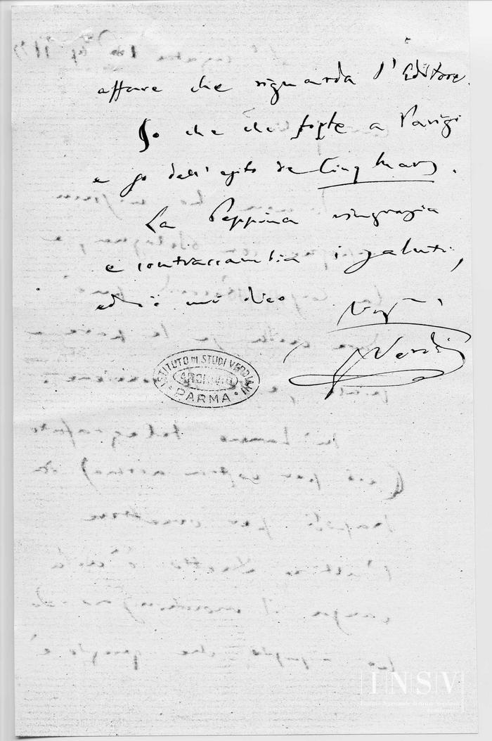 M'hanno telegrafato (ciò per vostra norma) da Napoli per omettere l'ultimo Duetto d'Aida causa il macchinismo. Io ho risposto che questo è affare che riguarda l'Editore.