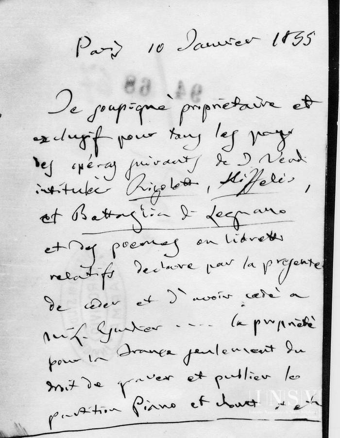 Je soussignè proprietaire et exclusif pour tous le pays des opéras suivants de J.Verdi intitulés Rigoletto, Stiffelio, et Battaglia di Legnano et des poemas ou libretti relatifs declare par la presente de ceder et d'avoir cedè a M.L.Escudier....la propriété pour la France seulement du droit de graver et publier la partition Piano et chant et et.
