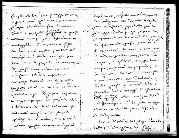 La sola Scala che si regge ancora, nissuno può assicurare che non si possa chiudere fra breve. Tutti i progetti suggeriti proposti in questi ultimi tempi sono difficilmente realizzabili. Il repertorio fisso da noi, col nostro pubblico è impossibile! Date per es. per due anni di seguito la compagnia di quest'anno colle opere migliori del loro repertorio compreso Maurel col Rigoletto Amleto et et e poi me ne direte qualumque cose. Bisogna lasciare a ciascun paese la propria indole e tollerare da noi talvolta gli indecenti chiassi e gli stupidi giudizi!.. È, ma è così!