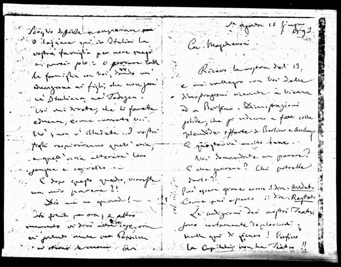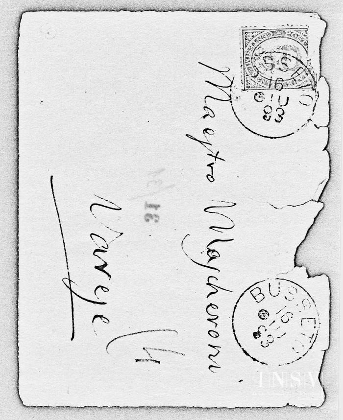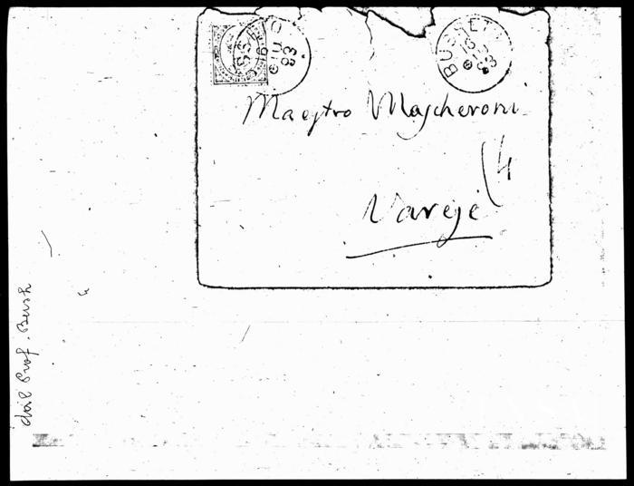 - Un bifolio, quattro facciate scritte, con busta affrancata (20 cent.). Sulla busta, di altra mano: «4».