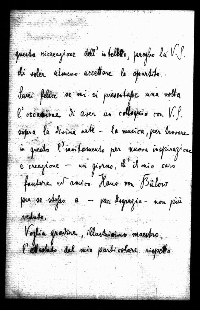Sarei felice se mi si presentasse una volta l'occasione di aver un colloquio con V. S. sopra la divina arte – la musica, per trovare in questo l'incitiamento per nuova ispirazione e creazione – un giorno ch'il mio caro fautore ed amico Hans von Bülow per se stesso ha – per disgrazia – non più veduto.