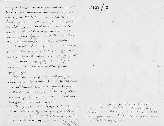 la scrittura ed i Lombardi vanno avanti, come Dio, vuole, con un supplemento – La Fidanzata corsa fiasco, non si è finita: nissuno salvato. Io non l'ho sentita perché in quel tempo sono stato per due giorni a Verona per scritturare un tenore e fare alcune prove del Nabucco che è andato bene – Sabato qui vanno colla Lucrezia colla Loeve, con Baldanza, e Meini – Non posso dirle quando andrà l'Ernani, ma è tempo perché aspetto Guasco. Mi si dice che Guasco stia male... benissimo... opera compita. Così l'Ernani andrà in scena con una prima donna alta alta di statura e di corista; con un basso basso di statura e che non si sente; con un tenore senza fiato et... Si può dare miglior complesso?... Stiamo fra noi queste cose.
