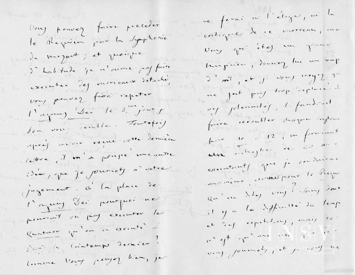 Pour le logement, il me faudrait avoir deux chambres à coucher pour moi, et ma femme et un salon: oubien une grande chambre à coucher avec deux lits, et un salon. Cela possiblement au premieretage, mais tout au plus au second. Nous serons à Cologne pas plus tard du 14 Mai. Vous pouvez faire preceder le Requiem par la Symphonie de Mozart; et quoique d’habitude je n’aime pas faire executer des morceaux detaché, vous pouvez faire repeter l’Agnus Dei le 3.me jour si bon vous semble. Toutefois après avoir reçue votre dernière lettre, il m’a poussé une autre idée, que je soumets à votre jugement. À la place de l’Agnus Dei pourquoi ne pourrait on pas executer le Quatuor qu’on a exe cuté à Paris le Printemps dernier? Comme vous pensez bien, je ne ferai ni l’eloge, ni la critique de ce morceau; ma Vous qui étes un grand musicien, donnez lui un coup d’oeil, et si vous croyez qui ne soit pas trop deplacé de vois solennites, il faudrait fair redoubler chaque instruments par 10 o 12, en formant un orchestre de 40 au 48 executants que je conduirai moi même, comme pour le Requiem. Qu’en dites vous? Sans dout il y a la difficulté du temp et des repetitions, mais ce n’est qu’une idée que ne vour soumets, et si vous ne la trouvez pas bonne, ou d’une realisation trop difficile, n’en parlons plus.