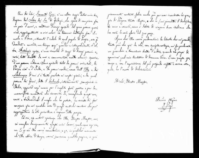 Ed ora, oso nutrir speranza che Ella, Illustre Maestro, vorrà accoglier benignamente questi miei lavori, qualunque essi siano. E se ciò Ella vorrà concedermi, e se, in qualche momento ch'Ella abbia di tempo, vorrà scorrerne qualche pagina, io sarò pienamente contento, felice anche più per aver incontrata la grazia di Persona tanto illustre, che io (mi permetta di dirlo) tanto amo e venero, come è debito di ciascun buon italiano che ha care le vere glorie del suo paese.