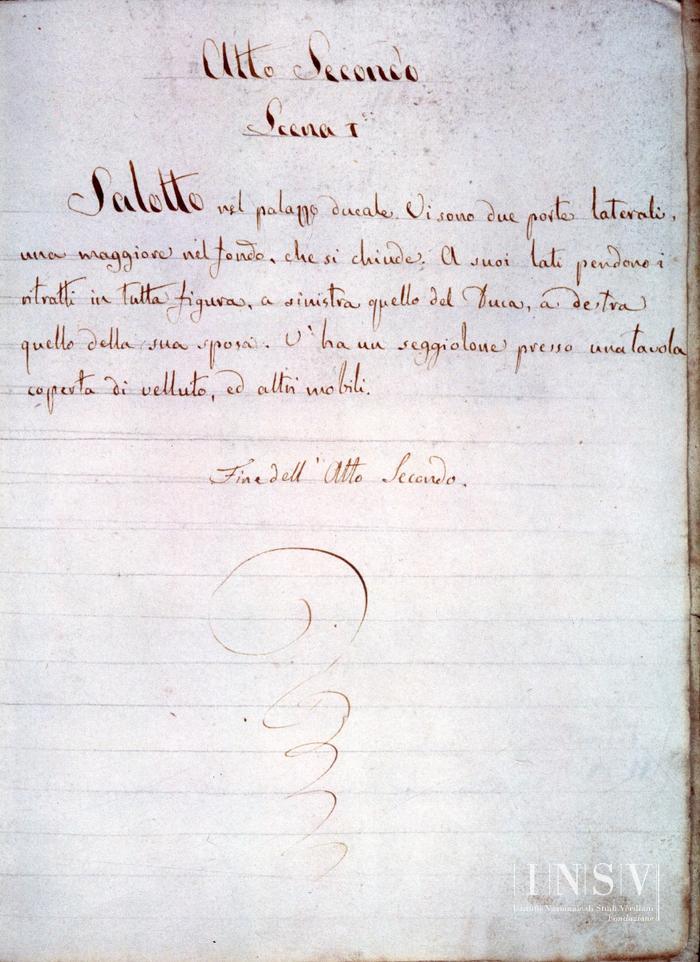 Sulla pagina di sinistra, in basso: «Fine dell'atto primo». Didascalie numerate su entrambi gli schizzi.