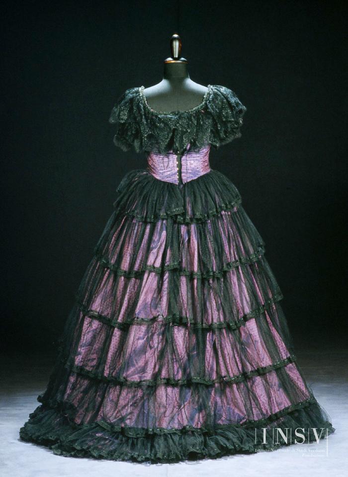 Abito in seta lilla cangiante blu, velatura e balze tulle a pois nero; balze alla gonna rifinite con nastrino raso nero, berta a doppio strato di pizzo nero; fiori allo scollo; manichine organza e pizzo neri; sottogonna attaccata taffetas nero; crinolina con volants cotone avorio; acconciatura con cerchietto fiori rosa e viola, pizzo nero, nastri oro; guanti lunghi filanca lilla chiaro; busto steccato con avorio.