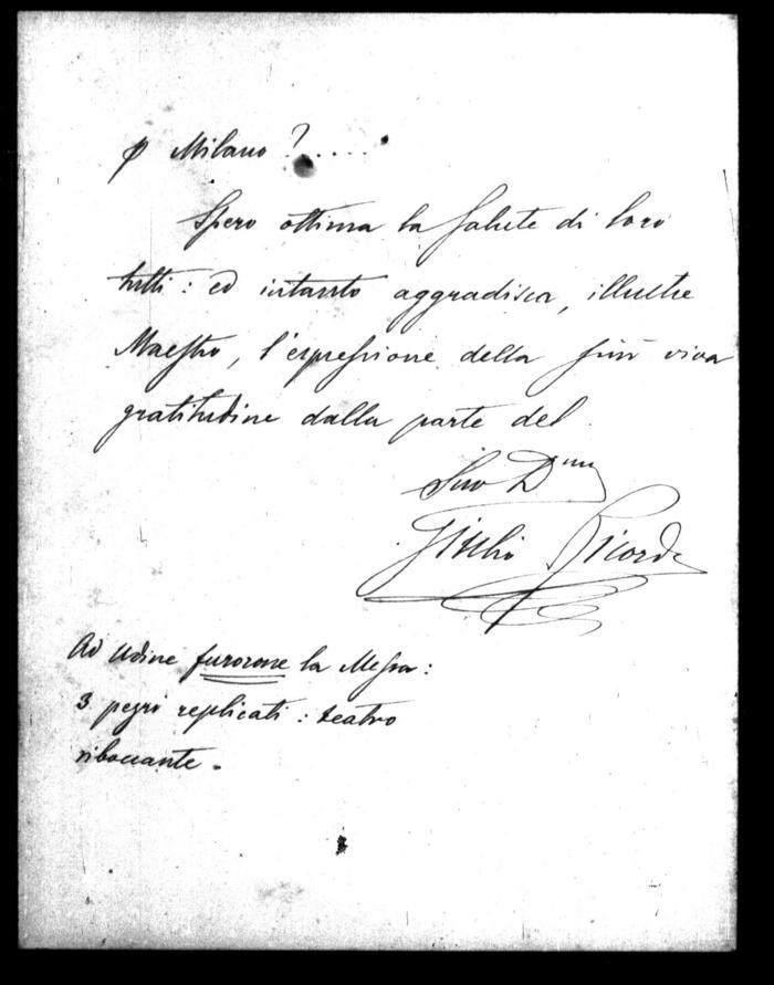 Apri l'inventario completo Corrispondenza Giulio Ricordi a Giuseppe Verdi, 04/09/1878 Versione stampabile Copy link Data Data Milano, 4 settembre 1878Luogo di destinazione Luogo di destinazione BussetoTipologia letteraUbicazione presso il soggetto conservatore Ubicazione I-BSAvTrascrizione Due righe per darle avviso che ho pagate, dietro biglietto della Sig.a Maffei, £ 200, che marcai a di Lei conto. Non ebbi avviso da lei, ma trattandosi della Sig.ra Chiarina, ho creduto di ben fare, senza aspettare cenno preventivo. [...]Note "R. STABILIMENTO [...] LONDRA" cfr. anche 128_73 Media Giulio Ricordi a Giuseppe Verdi, 04/09/1878 Prev 1 / 4 Next Relazioni Appartiene a Corrispondenza Filtri Ricordi, GiulioVerdi, GiuseppeUnità documentariaCorrispondenza