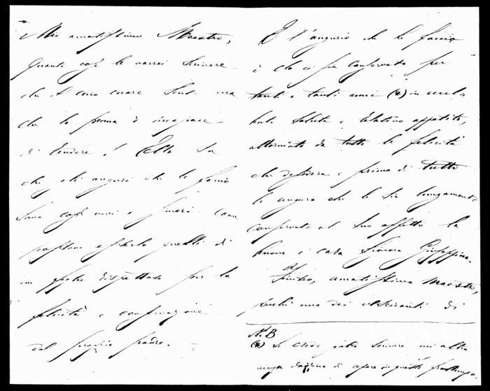 Mio amatissimo Maestro, quante cose le vorrei scrivere che il mio cuore sente ma che la penna è incapace di rendere! Ella sa che gli auguri che le faccio sono così vivi e sinceri come possono esserlo quelli di un figlio rispettoso per la felicità e conservazione del proprio padre.