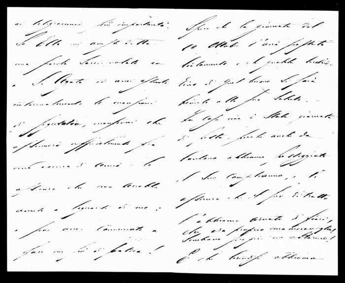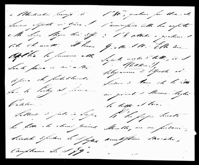 S. E. il Ministro Rattazzi della Casa Reale jeri scrivendomi per ricordarmi la promessa che gli avevo fatto a Roma di fargli una visita a Monza, mi trascrisse (sapendo di darmi piacere) il testo del bellissimo telegramma che Sua Maestà il Re ha inviato a Lei per il suo compleanno. Ciò mi ha fatto ricordare che il passato Aprile mentre eravamo a Roma per il Falstaff mi aveva esternato il desiderio di avere una sua fotografia. Allora con tante cose ho dimenticato di dirglielo, ora però ho pregato Giulio di inviarle una fotografia, e s'Ella vorrà scriverci la sua firma farà una cosa gradita anche a me. Giulio poi la ritirerà quando verrà a S. Agata ed io lo porterò in novembre a Roma ove si troverà Rattazzi. A proposito il novembre andrò a Roma a dirigere una breve stagione sino al 1° dicembre dovendomi trovare a quell'epoca alla Scala per cominciare le prove della Walkiria: ed a proposito di Scala c'è sempre il progetto di dare la Miller, progetto che si potrà attuare qualcosa si trovi una compagnia ad hoc. Per il baritono mi pare andrebbe bene il Kashman che è scritturato per la quaresima: andrebbe Oxilia che ha buona voce e accento caldo e buona intelligenza. Per la Scala ci sarebbe la Darclee (un po' profonda ma bella voce) o la Ferrani che l'anno scorso cantò con gran successo la Manon Lescaut a Torino e che canterà pure quest'opera con me a Roma in Novembre (gliene scriverò in proposito) oppure la Bellincioni, quella tale a cui Lei a Montecatini promise di scrivere apposta un'opera! Ma senza Stagno sarà difficile che accetti. Il tenore Oxilia lo proveremo alla Scala prima in un'altra Opera che probabilmente sarà la Loreley del povero Catalani.
