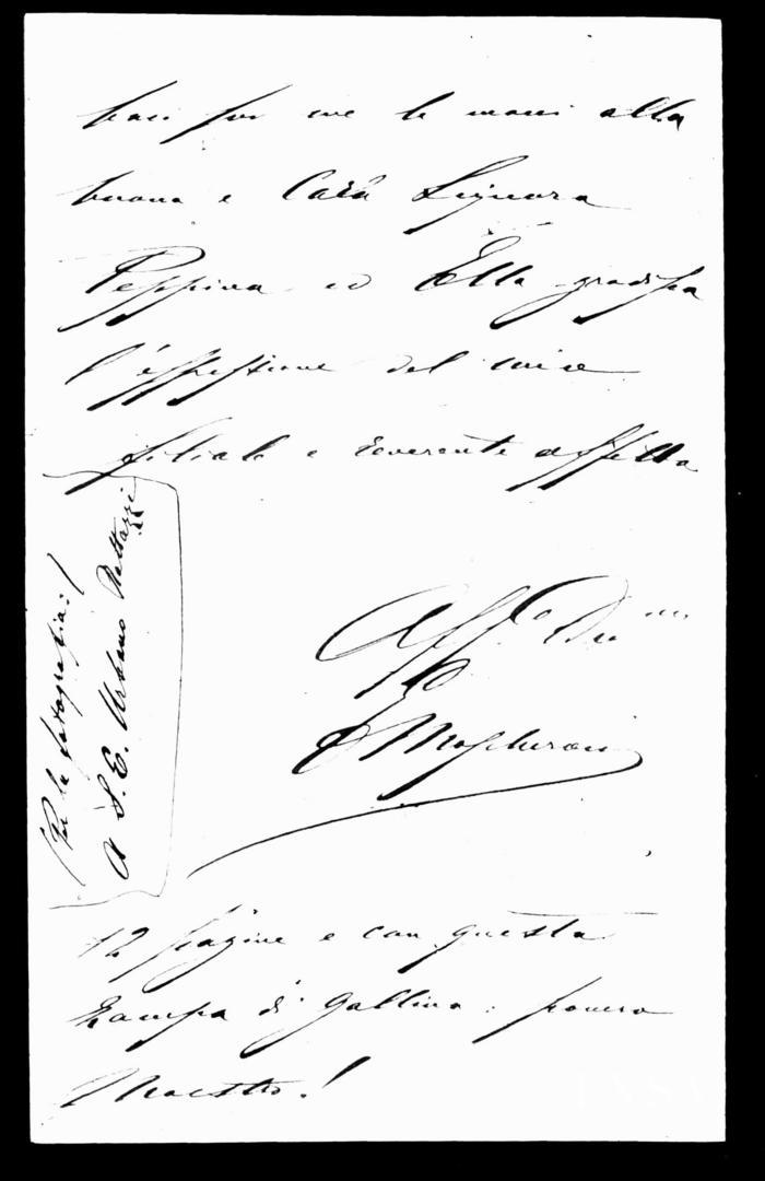 Vi ho proprio seccato stavolta, ma mi perdoni, amatissimo Maestro; baci per me le mani alla buona e cara Signora Peppina ed Ella gradisca l'espressione del mio filiale e reverente affetto