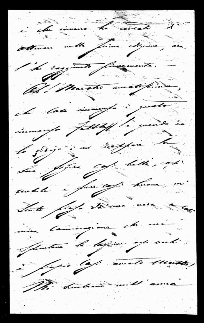 Se vedesse l'entusiasmo, la compiacenza e dirò la gioja dai miei ottimi professori d'orchestra quando suonano il Falstaff. Aggiungerò, perché è la pura verità, che l'esecuzione orchestrale stavolta è anche migliorata dalla prima rappresentazione, ed anche quello stonati agli archi nella scena della cesta e che invano ho cercato di ottenere nella prima edizione, ora l'ho raggiunto fieramente. —