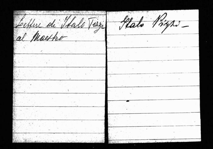 Apri l'inventario completo Serie Italo Pizzi Versione stampabile Copy link Tipologia Camicia archivisticaNote Contiene sei lettere e due biglietti da visita inviati da Italo Pizzi a Giuseppe Verdi fra 1884 e 1894. Media Italo Pizzi Prev 1 / 2 Next Relazioni Appartiene a Corrispondenza Filtri Serie
