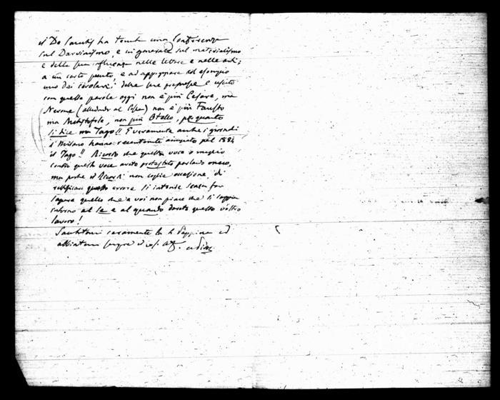 Ultimamente (lasciando a parte la politica) il De Sanctis ha tenuta una Conferenza sul Darvinismo, e in generale sul materialismo e della sua influenza nelle lettere e nelle arti; a un certo punto, e ad appoggiare col esempio uno dei corolarii delle sue premesse è uscito con queste parole oggi non è più Cesare, ma Nerone (alludendo al Cossa) non è più Fausto ma Mefistofele, non più Otello, per quanto si dice ma Jago!! E veramente anche i giornali di Milano hanno recentemente annunziato pel 1884 il Jago! Ricordo che questa voce o meglio contro questa voce avete protestato parlando meco, ma poiché il Ricordi non coglie occasione di rettificare questo errore si intende senza far sapere quello che a voi non piace che si sappia intorno al se e al quando darete questo vostro lavoro! Salutatemi caramente la s. Peppina ed abbiatemi sempre io vos. aff.