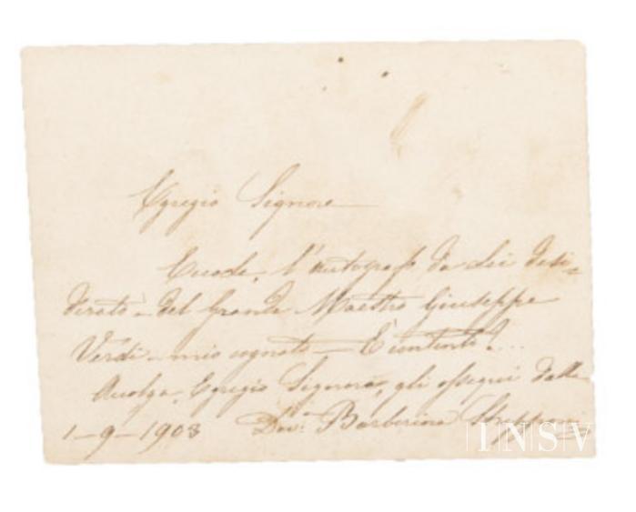 Il destinatario, omesso nella lettera, è qui proposto in analogia ad altre lettere al Mola. La lettera è stata donata da Barberina Strepponi nel 1908 con biglietto accompagnatorio, qui riprodotto.