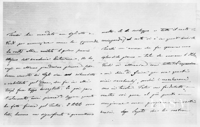 Siamo in Genova da diversi giorni e credo vi staremo ancora fino al 5 o 6 di marzo, a meno che la salute di mio suocero non ci obblighi a partire all'improvviso, ciò che spero non sia per avvenire. Vi moverete voi da Napoli? Dove andrete e quando? Rispondetemi una parola. Torelli ha mandato un biglietto a Verdi per annunziare come la commedia La Verità abbia meritato il primo premio Ottaiano della Accademia Pontaniana. Ne ho, ne abbiamo anzi grandissimo piacere. Colla buona riuscita dei figli vien ribenedetto e riabilitato quel nome, che fu in altri tempi forse troppo bersagliato. Io poi particolarmente avrei piacere di leggere quanto ha fatto finora pel teatro. I titoli sono belli, hanno un significato, e promettono molto. Se lo sviluppo e tutto il resto vi corrisponde, certo vi è in questo Achille Torelli un'aurora che fa sperare uno splendido giorno, e tale da onorare l'Italia. Verdi vi abbraccia con tutta l'espansione e mi dice di finire per ora questi miei scarabocchi, perché i maccheroni sono in tavola. Fate un fardelletto e venite pure voi al più presto a mangiarne una porzione coi vostri amici.SapeSapete che la vostra venuta farà molto piacere a Verdi ed uno non minore alla vostra