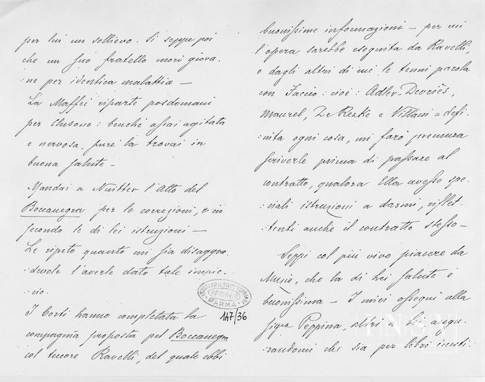 I Corti hanno completata la compagnia proposta pel Boccanegra col tenore Ravelli, del quale ebbi buonissime informazioni – per cui l'opera sarebbe eseguita da Ravelli e dagli altri di cui le tenni parola con Faccio: cioè: Adler-Devriès, Maurel, De Rezke e Villani = definita ogni cosa, mi farò premura scriverle prima di passare al contratto, qualora Ella avesse speciali istruzioni a darmi, riflettenti anche il contratto stesso –