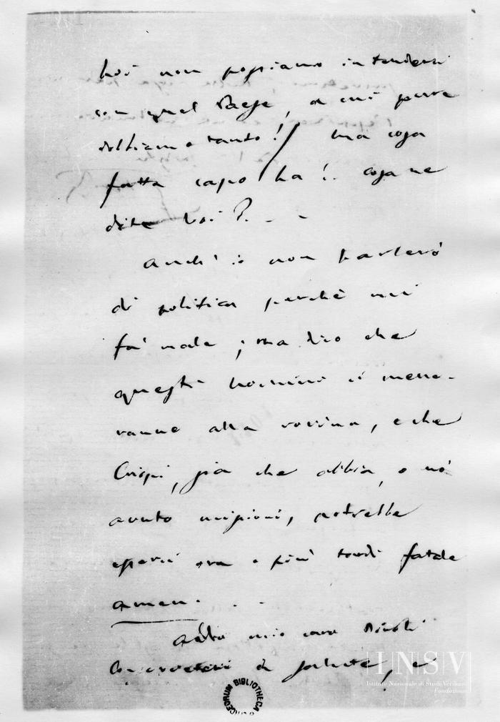 Anch’io non parlerò di politica perché mi fà male; ma dico che questi uomini ci meneranno alla rovina, e che Crispi, sia che abbia, o nò avuto missioni, potrebbe essere ora o più tardi fatale amen.