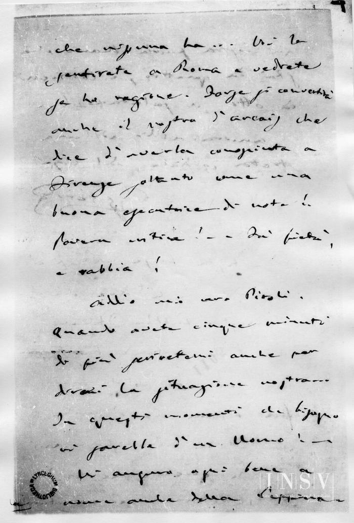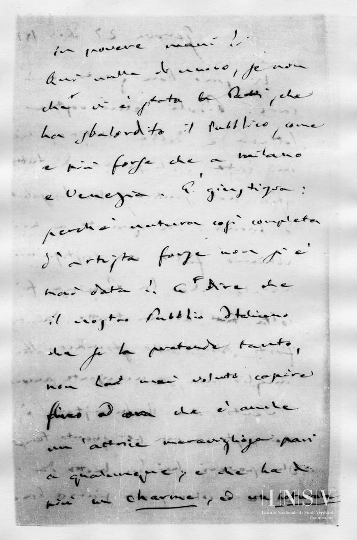Quì nulla di nuovo, se non ché vi è stata la Patti, che ha sbalordito il Pubblico, come e più forse che a Milano e Venezia. È giustizia: perché natura così completa d’artista forse non si è mai data!. E dire che il nostro Pubblico Italiano che se la pretende tanto, non ha mai voluto capire fino ad ora che è anche un’attrice meravigliosa pari a qualumque, e che ha di più un charme, ed un naturale che nissuna ha... Voi la sentirete a Roma e vedrete se ho ragione. Forse si convertirà anche il vostro d’Arcais, che dice d’averla conosciuta a Firenze soltanto come una buona esecutrice di note!. Povera critica!... Fà pietà, e rabbia!