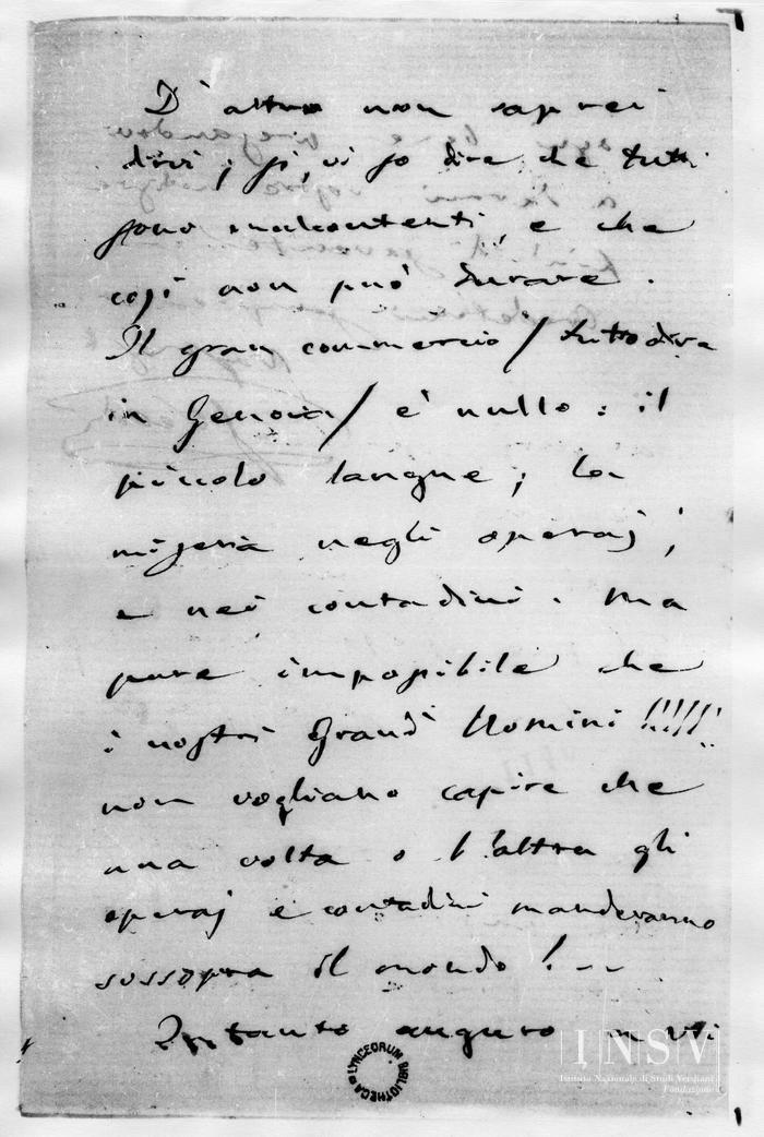 D’altro non saprei dirvi; sì, vi so dire che tutti sono malcontenti, e che così non può durare. Il gran commercio (tutto dire in Genova) è nullo: il piccolo langue; la miseria negli operaj, e nei contadini. Ma pare impossibile che i nostri Grand’Uomini!!!!!!. non vogliano capire che una volta o l’altra gli operaj e contadini manderanno sossopra il mondo!...