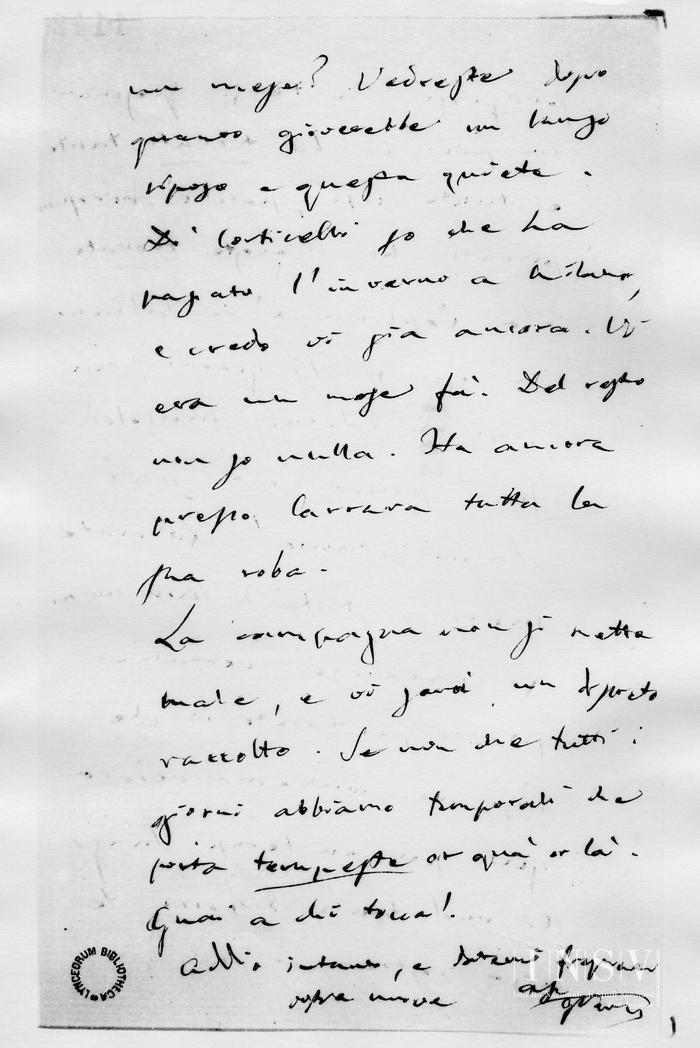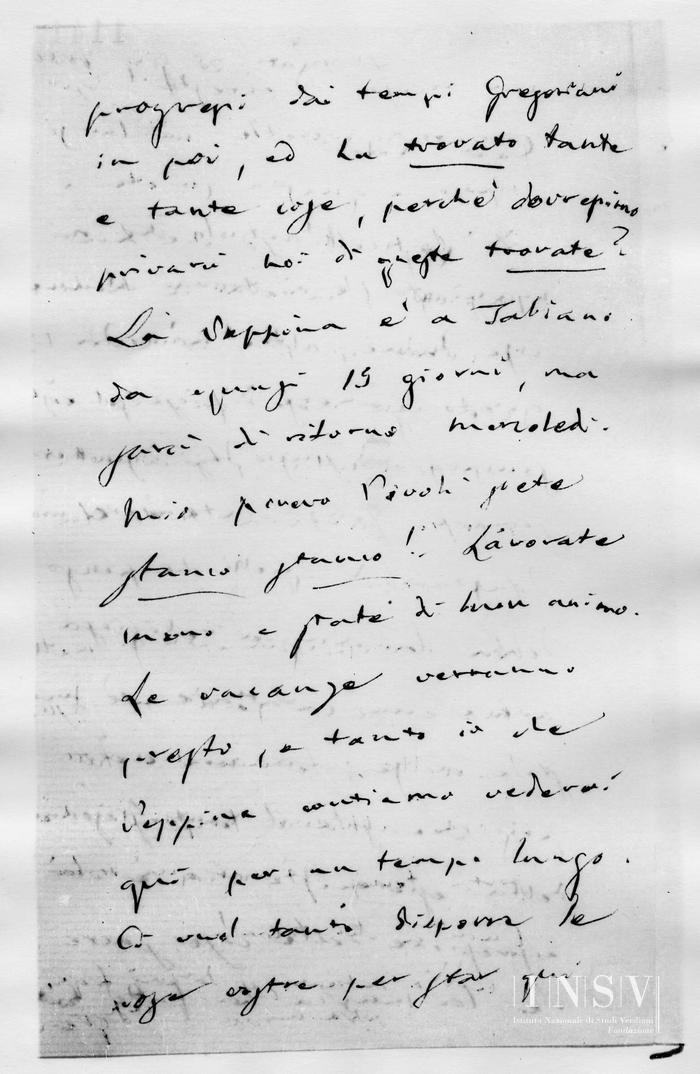 La Peppina è a Tabiano da quasi 15 giorni, ma sarà di ritorno Mercoledì. Voi povero Piroli siete stanco stanco! Lavorate meno e state di buon animo. Le vacanze verranno presto, e tanto io che Peppina contiamo vedervi quì per un tempo lungo. Ci vuol tanto disporre le cose vostre per star quì un mese? Vedreste dopo quanto gioverebbe un lungo riposo a questa quiete. Di Corticelli so che ha passato l’inverno a Milano, e credo vi sia ancora. Vi era un mese fà. Del resto non so nulla. Ha ancora presso Carrara tutta la sua roba.