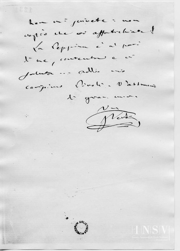 La Peppina è al pari di me, contenta e vi saluta... addio mio carissimo Piroli. V’abbraccio di gran cuore