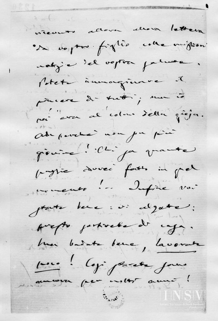 Non ho voluto scrivervi finora: non ho voluto darvi disturbo, nemmeno ad obbligarvi a leggere una mia lettera; ma io aveva egualmente notizie vostre e frequenti. Il nostro buon Arrivabene mi ha scritto quattro volte sul vostro conto e molto dettagliatamente. Ieri poi a Busseto (ove fui, s’in tende a St Agata, per tre giorni) il Dottore mi disse che aveva ricevuto allora nuova lettera da vostro figlio colle migliori notizie del vostra salute. Potete immaginare il piacere di tutti; ma io poi era al colmo della gioja. Ah perché non son più giovine! Chissà quante pazzie avrei fatto in quel mo mento!... Infine voi state bene: vi alzate; presto sortirete di casa. Ma badate bene, lavorate poco! Così starete sano ancora per molti anni!