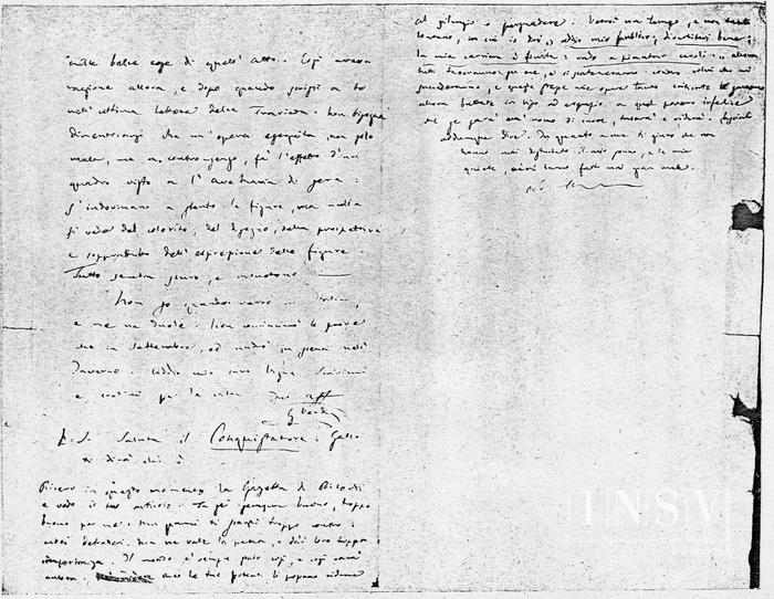 L'anno passato, la mattina dopo la prima recata della Traviata", Gallo venne da me ed a nome anche del nostro comune amico mi fece alcune osservazioni particolarmente sul terzo atto. Io risposi semplicemente: Credo t'inganni: mi pare il migliore. Ora mi scrive mille belle cose di quell'atto. Così avevo ragione allora e dopo quando scrissi a te nell'ultima lettera della a Traviata". Non bisogna dimenticare che un'opera eseguita non solo male ma a controsenso fa l'effetto d'un quadro visto all'Ave Maria di sera: s'indovinano a stento le figure ma nulla si vede del colorito, del disegno, della prospettiva e sopratutto delle espressioni delle figure. Tutto sembra scuro e monotono. —