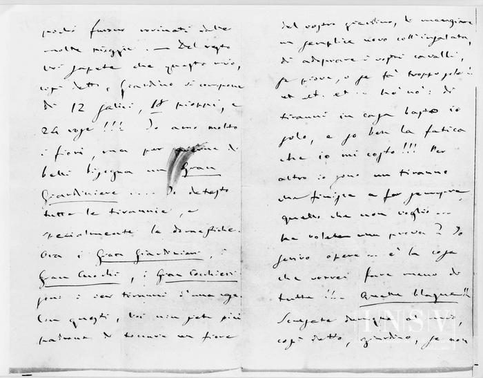 La Peppina son molti giorni ordinò a quello, che chiamano, nostro giardiniere di fare un gran cesto di fiori di tutte le qualità per mandare a Voi. Questo, così detto, nostro giardiniere venne tutto mortificato da me, dicendomi che di fiori non ne aveva quasi, ad eccezione di rose, prima perché io ne faccio coltivare pochissimi' poi perché quei pochi furono rovinati dalle molte pioggie.– Del resto Voi sapete che questo mio, così detto, Giardino si compone di 12 salici, 18 pioppi, e 24 rose!!! lo amo molto i fiori, ma per averne di belli bisogna un Gran Giardiniere... Io detesto tutte le tirannie, e specialmente le domestiche. Ora i Gran Giardinieri, i Gran Cuochi, i Gran Cocchieri sono i veri tiranni d'una casa. Con questi, Voi non siete più padrone di toccare un fiore del vostro giardino, di mangiare un semplice uovo coll'insalata, di adoprare i vostri cavalli, se piove, o se fà troppo sole! etc. etc. etc.... Nò, no: di tiranni in casa basto io solo, e so ben la fatica che mi costo!!! Per altro io sono un tiranno che finisce a far sempre quello che non voglio... Ne volete una prova? Io scrivo opere... è la cosa che vorrei fare meno di tutte!!... Quelle blague!!... Scusate dumque al mio, così detto, giardino, se non ha fiori belli, e degni d'essere mandati a Voi –