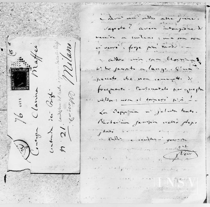 - Un bifolio e un foglio, sei facciate scritte, con busta affrancata (20 cent.). Sulla busta, accanto all'indirizzo, di altra mano: «condizione del teatro d'opere in Italia e Parigi» e «76», 15», «16».