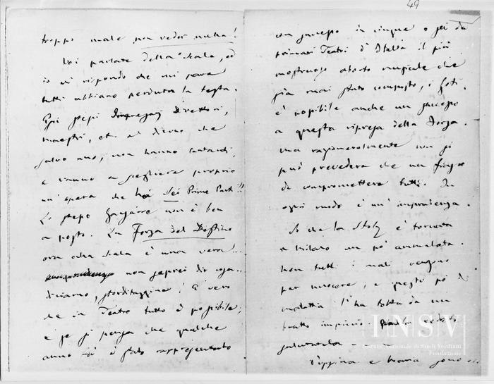 Voi parlate della "Scala" ed io vi rispondo che mi pare tutti abbiano perduta la testa. Essi stessi Impresarj, Direttori, Maestri, etc. etc. dicono salvo uno, non hanno cantanti, e vanno a scegliere proprio un'opera che ha sei Prime Parti!! Lo stesso Gayarre non è ben a posto. La Forza del Destino ora alla Scala è una vera... non saprei dir cosa... diciamo, storditaggine! E vero che in Teatro tutto è possibile; e se si pensa che qualche anno fà è stato rappresentato con successo in cinque o sei dei primari Teatri d'Italia il più mostruoso aborto musicale che sia mai stato composto, i Goti, è possibile anche un successo a questa ripresa della Forza. Ma ragionevolmente non si può prevedere che un fiasco da compromettere tutti. In ogni modo è un'imprudenza.