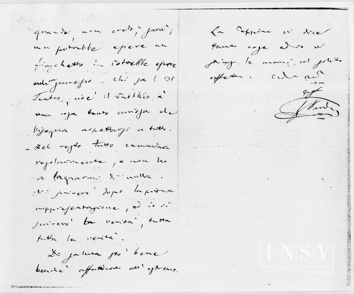 Avrei dovuto scrivervi prima, e dovrei adesso scrivervi una lettera lunga lunga, ma mi manca il tempo. Io stò all'Opéra, credo, 26 ore al giorno! Desidero sapere tutto, e voglio anche veder tutto quello che si fà in quel Teatro della mia opera, e così mi ammazzo di fatica; forse per riuscire ad un fiasco... Nò: un fiasco grande, non credo, sarà; ma potrebbe essere un fiaschetto... Potrebbe essere anche un successo... Chi sa! Il Teatro, cioè il Pubblico è una cosa tanto curiosa che bisogna aspettarsi a tutto. Del resto tutto cammina regolarmente, e non ho a lagnarmi di nulla. Vi scriverò dopo la prima rappresentazione, ed io vi scriverò la verità, tutta tutta la verità.