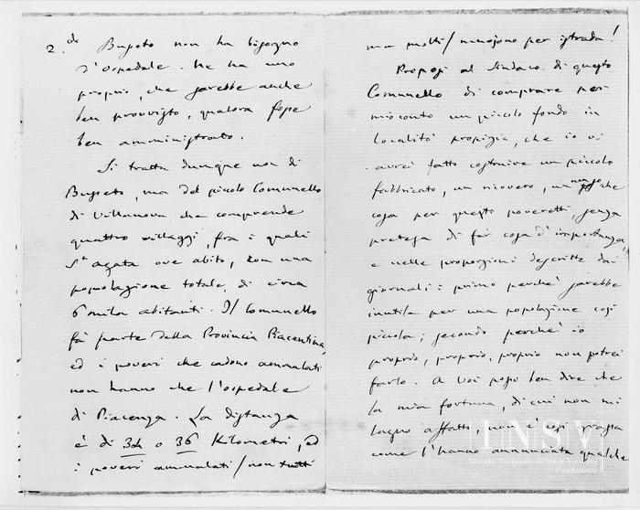 Si tratta dunque non di Busseto, ma del piccolo Comunello di Villanova, che comprende quattro villaggi, fra i quali St Agata ove abito, con una popolazione totale, di circa 6 mila abitanti. Il Comunello fà parte della Provincia Piacentina, ed i poveri che cadono ammalati non hanno che l’ospedale di Piacenza. La distanza è di 34 o 36 chilometri, ed i poveri ammalati (non tutti ma molti) muojono per istrada!