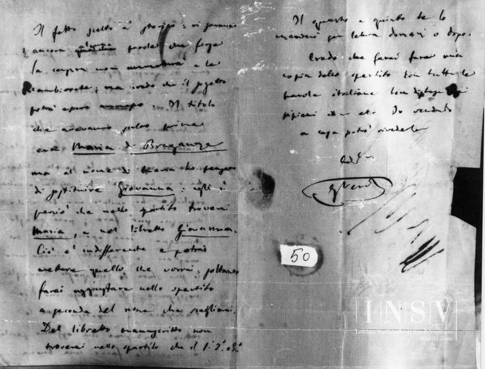 Il fatto scelto è storico: vi saranno ancoraqualchealcune parole che forse la censura non ammetterà e le cambierete; ma credo che il sogetto potrà essere ammesso. Il titolo che avevamo scelto prima era Maria di Braganza ma al nome di Maria ho pensato di sostituire Giovanna: egli è perciò che nello spartito troverai Maria, e nel libretto Giovanna.