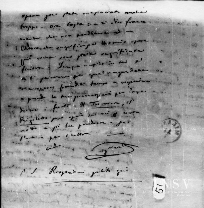 Quello che deve ora interessarci si è di badare bene prima di dare delle mie Opere. Tu lo sai per esperienza le mie opere senza il mio ajuto quì sono impossibili. Non giova vi siano tutti i migliori cantanti della terra senza di me non andranno mai almeno per ancora 4 o 5 anni. Ti serva ciò a non dare il tuo consenso troppo leggermente per il guadagno miserabile di poche migliaja di franchi. Le mie opere sono state massacrate anche troppo- Ora basta: e ti dico francamente che non perdonerei ad un Editore che sagrificasse le mie opere quì come sono state sagrificate finora. Dunque confido in te e se ti scriveranno per qualunque delle mie opere prenditi tempo a rispondere e prendi le tue precauzioni per impedirne i furti. Il Trovatore, il Rigoletto sono opere su cui si conta molto e sii ben prudente e per l'una e per l'altra