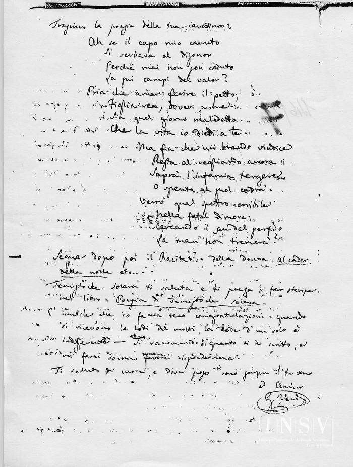 Se tardi ti giunge quest'aria la colpa non è mia: soltanto l'altra sera ho saputo che tu desideravi questo ed appena avuta la poesia non ho consumato un minuto di tempo. Eccoti adumque l'aria, la quale, detta dalla tua abilità e potentissima voce, spero farà effetto. Tu farai il recitativo che precedeva il Duetto, e qui, come vedrai ne ho trasportato un pezzo per adattarlo al tono dell'aria e sarà anche meglio per la tessitura tua. L'adagio è un cantabile di passione tranne gli ultimi due versi, e dove comincia il passo [sia quel giorno ma...] potrai stringere un poco più il tempo ma non troppo perchè non avressimo più l'effetto al forte: ma già io credo che starà bene per la tua voce, come quella dell'Aria del secondo atto bada che nella cadenza della cabaletta dove incominciano le note sincopate vi sia un crescendo ben grado anche dall'orchestra ed allora vedrai che vi sarà l'effetto. Io ti raccomando poi caldamente l'esecuzione di quest'opera. Bada che il primo atto non riesca troppo lungo, e se la prima donna volesse omettere la sua cavatina sarebbe meglio ottenuto che vi sono tre cavatine di seguito. Ma basta di questo e parliamo d'altro.