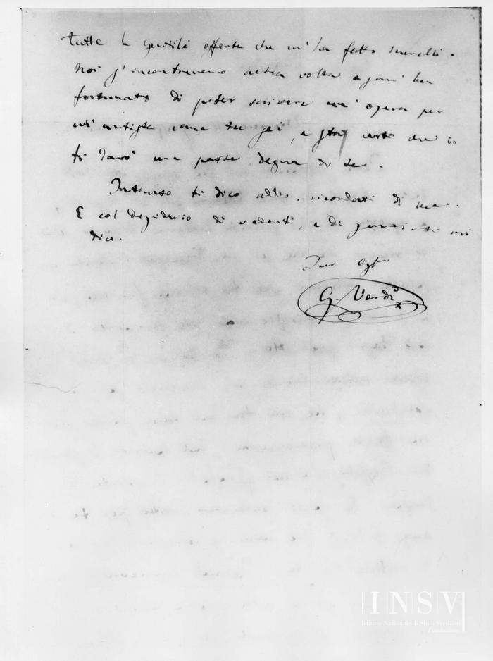 Jeri soltanto mi fu consegnato dal M.° Rossi la tua lettera del 20 Aprile, e questa è la prima lettera, ti giuro, che io ricevo da che sei in Ispagna. Sento con piacere estremo che tu ritorni fra noi, ed i Milanesi accoglieranno con trasporto il loro basso prediletto. Io ho scritto due opere ultimamente il Nabucco, ed i Lombardi, in cui tu hai una parte, in cui forse primeggerai. Nel Nabucco la parte del Profeta, e nei Lombardi la parte di Pagano le quali sembrano scritte per te, ed anzi ti dirò che avrei grandissimo desiderio di sentirle da te. Io nel Carnevale scriverò a Venezia perché non voleva arrischiarmi a scrivere al momento un'altra opera a Milano, e sono stato costretto a rifiutare tutte le gentili offerte che m'ha fatto Merelli. Noi s'incontreremo altra volta e sarò ben fortunato di poter scrivere un'opera per un'artista come tu sei, e stai certo che ti darò una parte degna di te.