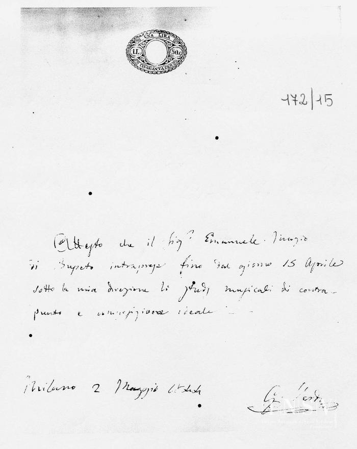 Attesto che il Sig.r Emanuele Muzio di Busseto intraprese fino dal giorno 15 Aprile sotto la mia direzione li studj musicali di contra-punto e composizione ideale. ———