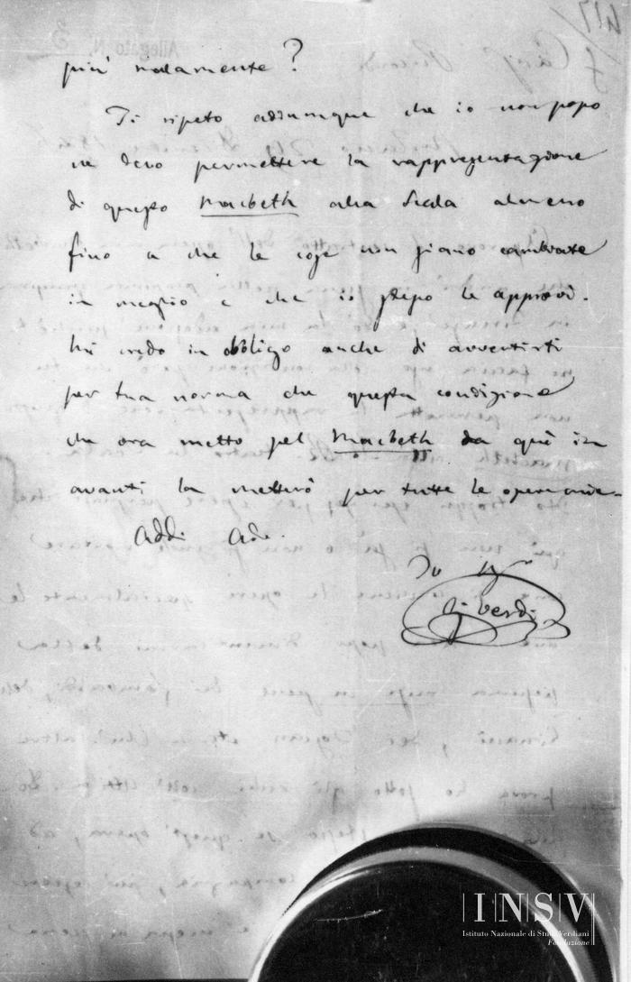 Approvo il contratto dell'opera mia Macbeth che andrà in scena nella prossima quaresima in Firenze, e dò la mia adesione perchè tu ne faccia uso colla condizione però che tu non permetta la rappresentazione di questo Macbeth all'I.R. teatro la Scala.