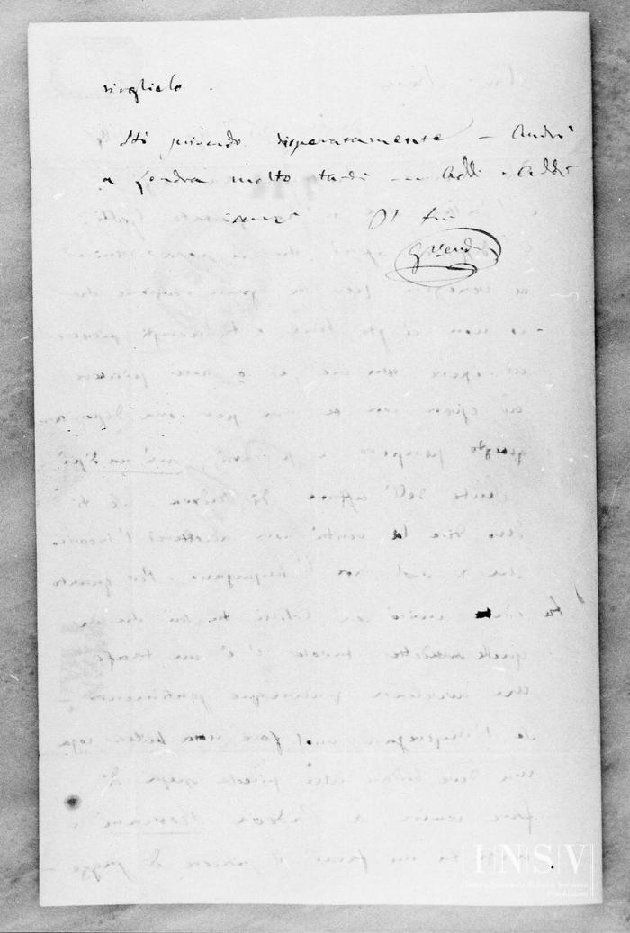 Ho ricevuto l'ultima tua cariss|a. e l'altra che m'ha portato Galli. È difficile assai che io possa venire Venezia per la gran ragione che io non ci sto bene..., tu avresti piacere ad essere con me, ed io avrei piacere ad essere con te, ma per ora deponiamo questo pensiero e se sarà, sarà un di più...