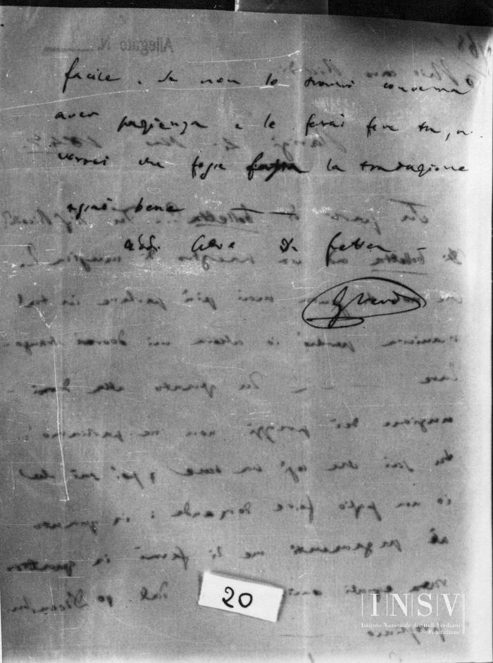 - Un bifolio (21×13,5 cm), due facciate scritte, con indirizzo sulla quarta. Sulla prima facciata, in alto a sinistra, di altra mano: «768/d»; a destra, prestampato: «Allegato n.» e a lapis rosso: «4». Sulla quarta facciata, a matita, di mano recente. «Verdi I-20». Piccolo strappo al centro del margine esterno del secondo foglio.